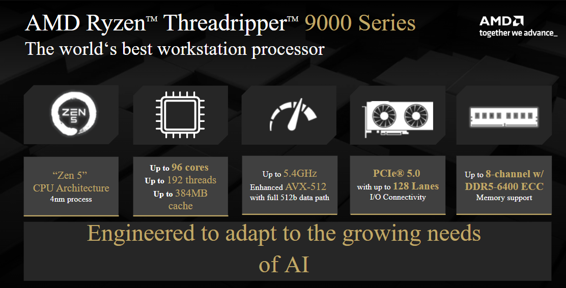 Based on the cutting-edge Zen5 architecture and built using TSMC’s 5nm process, these CPUs are the latest release in AMD’s HEDT (High-End Desktop) and Professional Workstation markets. The 9000 series replace the previous 7000X and Pro 7000WX lines with performance gains, improved efficiency and platform continuity via the sTR5 socket, meaning drop-in replacements are possible.