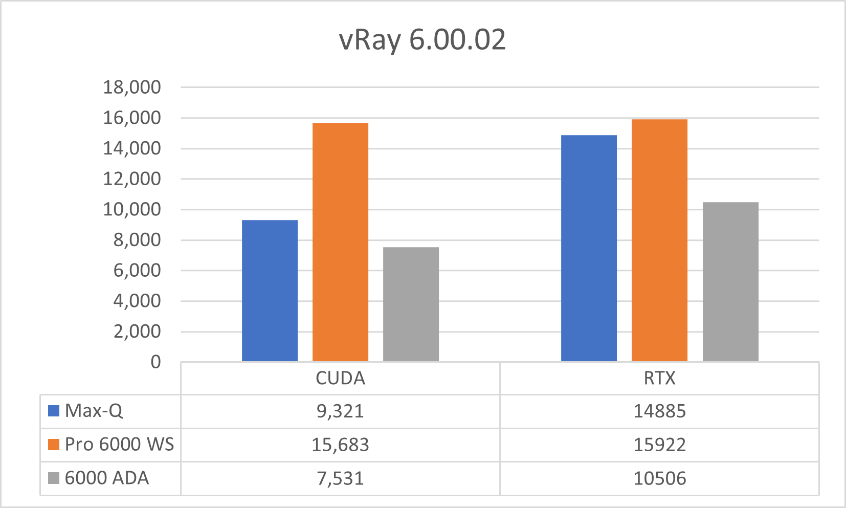 Once again, the RTX PRO 6000 Blackwell Max-Q outperformed the NVIDIA RTX 6000 Ada Generation across both tests. With the parallel CUDA test, it saw an improvement of ~24%; with the real time Ray Tracing it outperformed it at the ~42% mark.